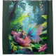 Ein winziges Mädchen und ein Schmetterling mit riesenhaften Flügeln, auf einer riesigen Blume in einem üppigen Dschungel, begleitet von einem bunten Toucan. Große Blätter und lebendige Blume umgeben sie und schaffen eine magische, skurrile Szene. Digitale Kunstfotografie CS6