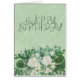 Feiern Sie ihren besonderen Tag mit der friedlichen Schönheit von Grün und Blumen. Diese Geburtstagskarte von The Botanical Press zeichnet sich durch einen sanften, grünen Hintergrund mit subtilen botanischen Mustern aus, die durch eine üppige Aquarellanordnung aus Eukalyptus, weißen Rosen und zarten Blüten hervorgehoben werden. Die fließende, handgeschriebene "Happy Birthday"-Nachricht verleiht dem Gast ein anmutiges, Bio Gefühl - ideal für Pflanze- und Naturfreunde.