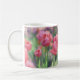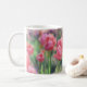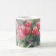 Ein Foto von schönen Tulpen, die im Garten blühen und auf einer klassischen Tasse gedruckt sind.