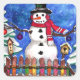 Original Aquarellmalerei von Sandra Gale eines glücklichen Schneemanns in einem schneebedeckten Wintergarten. Großartiges Design für Gärtner, Kinder, Mamas und alle, die Schneemänner und Landgartenszenen mögen.