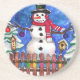 Original Aquarellmalerei von Sandra Gale eines Schneemanns, der vor einem Picketzaun stehend ist, mit leuchtenden Weihnachtslichtern, die den Winterschnee abstrahlen. Vögel, Vogelhäuser und Weihnachtsschmuck machen das zu einer klassischen Weihnachtslandschaft, die auf Papier, Weihnachtskarten und vielem mehr großartig aussieht!