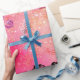 Surreale, farbenfrohe und fantastische gemischte Mediagemälde in goldenen Glitzern. Lebhafte magische Wirbel in rosa fuchsienrot, orange gelbe Glitzern mit goldener und silberner Folie. Das Thema betrifft Archetypen und mittelalterliche alchemische Symbolik. Dies ist eine destillierte Vision von einem orientalischen und kollektiven imaginären, die entfernte Bilder aus der Tiefe des geheimnisvollen Gartens der verlorenen Schatten sucht.