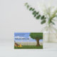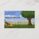 Eine benutzerdefinierte Visitenkarte mit einer Illustration eines Rasenmähers vor einem weißen Lattenzaun mit einem Baum und blauem Himmel. Dies ist perfekt für jemanden, der ein Rasenpflege-, Landschaftsbau- oder Gartenpflegeunternehmen betreibt. Einfach mit Ihren Informationen zu bearbeiten.