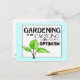 Das Design hat einen computerisierten zeichn eines Saatguts in der Ecke, und das Schreiben in verschiedenen Schriftart, die lautet "Gartenarbeit ist eine Übung in Optimismus".