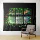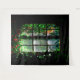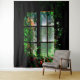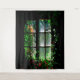 Woll ein zusätzliches Fenster in deiner Zuhause? Ein idyllisches Gartenfenster mit grünen Pflanze und einigen roten Blume. Dunkelgrüner und schwarzer Hintergrund.