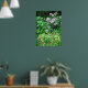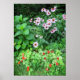 Das Poster der Sommergarten-Fotografie zeigt lila Blumen mit orangefarbenen Zentren und roten Nururien mit abwechslungsreichem Laub. Auch die großen Blätter eines Hydrangea-Busches vervollständigen dieses vertikale Blumenposter.