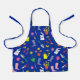 Niedliche blaue Schürze bedruckt mit einem Cartoon Gartenmuster. Wasserkonserven, bunte Stiefel, Blume, Töpfe, Gartengeräte und kleine Insekten schmücken diese bezaubernde Schürze der Kinder.