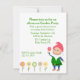 Bunte Party Einladung im Freien, mit Grafiken der hübschen kleinen Blumen, über der Unterseite und ein glücklicher Garten Gnome, auf der rechten Unterseite. Personifizieren Sie den grünen Text für Ihr Ereignis.