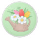 Gartengießen kann voll von Blume sein: Gänseblümchen, Tulpen und Babyatmen. Der Wassercan hat ein kleines Herz am Boden gemalt.