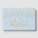 Dieses Gästebuch wird in einer benutzerdefinierten Farbe von Blue Fog-a Light Dusty Blue mit goldfarbenem, nicht "gold", Text und einem Vorhang aus goldfarbenen kleinen Sternen auf Vorder- und Rückseite des Gästebuches gezeigt. An der Vorderseite und im Rückgrat werden die beiden personalisierten Namen in einem extravaganten Skript gelesen, der Nachname im fett formatierten Textstil sowie das benutzerdefinierte Datum. Personalisieren Sie dieses Buch und passen Sie es an, wenn Sie es wünschen.