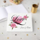 Dieses Gästebuch wird in Weiß mit hübsch rosa Rosen und Liebe mit benutzerdefinierten Beispielnamen angezeigt. Passen Sie dieses Buch an und ändern Sie die Namen in Ihr Buch.