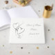 Dieses Gästebuch wird in Weiß mit einem hübschen Zweiherzen-Druck mit benutzerdefinierten Beispielnamen gezeigt. Passen Sie dieses Buch an und ändern Sie den Text in Ihren Text.