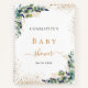 Eine weiße Hintergrundfarbe. Dekoriert mit Eukalyptusgrün, goldgelbem Blattwerk und Imitaten Glitzer, Glitzern. Fügen Sie einen Namen und ein Datum hinzu. Geschlechterneutral.
