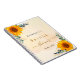 Ein goldfarbener Hintergrund. Sie ist mit Sonnenblumen, Eukalyptuspflanzen und goldenem Blattwerk dekoriert. Fügen Sie einen Namen und ein Datum hinzu.