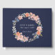 Dieses Gästebuch, das sich mit anderen Elementen in unserer Hochzeitskollektion Navy und Peach Watercolor Floral Wreath verbindet, verfügt über einen Blumenkranz in pfirsichen und blauen Aquarellen mit einem raffinierten marinierten Hintergrund.