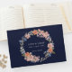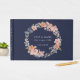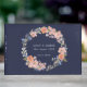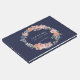 Dieses Gästebuch, das sich mit anderen Elementen in unserer Hochzeitskollektion Navy und Peach Watercolor Floral Wreath verbindet, verfügt über einen Blumenkranz in pfirsichen und blauen Aquarellen mit einem raffinierten marinierten Hintergrund.