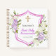 Ein weißer Hintergrund. Rosa Wappen, rosa und lila Blumen, Blumen. Mit einem goldenen Kreuz. Personalisieren und fügen Sie einen Namen und ein Datum hinzu. Kann als Gästebuch oder für die Planung der Veranstaltung verwendet werden.