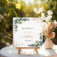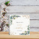 Eine weiße Hintergrundfarbe. Dekoriert mit Eukalyptusgrün, goldgelbem Blattwerk und Imitaten goldener Glitzer Staub. Geben Sie einen Namen, Alter und ein Datum ein.