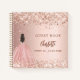 Ein Gästebuch für eine feminine und glamouröse Sweet 16, 16. Geburtstagsfeier. Eine stilvolle Rose goldener Hintergrund mit Konfetti und einem Mädchen, das ein Prinzessenkleid trägt, Ballkleid. Personalisieren Sie Ihren Namen und Alter/Datum und fügen Sie ihn hinzu. Der Name wird mit einem handgeschriebenen Stilskript geschrieben.