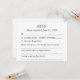 Diese RSVP-Karte für Hochzeiten bietet stilvolle schwarze Schriften und Platz für die Akzeptanz der Gäste, sowie eine Auswahl an Mahlzeiten und Songvorlieben. Bitte personalisieren Sie vor der Bestellung das Datum der Beantwortung (und jeden anderen Text, den Sie personalisieren möchten) mithilfe der Online-Personalisierungsvorlage. Wenn Sie das Layout der Vorderseite ändern möchten oder etwas auf der Rückseite der Karte hinzufügen möchten, klicken Sie bitte auf "Bearbeiten mit dem Design-Tool", um vor der Bestellung "weiter anpassen".