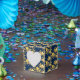 Gastgeschenk Box in einem festlichen Gold Sterne Print Design gezeigt. Color Navy Blau Passen Sie dieses Objekt an oder kaufen Sie, wie es ist. Bild