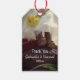 Vielen Dank, dass Sie Ihr rustikales Verlobung Stall Party, Brautparty oder Ehe Empfang besuchen, wenn Sie die bezaubernde Bride auf Red Tractor Country Farm Gastgeschenk Hochzeit Tag an ihrem Gastgeschenk oder kleinen Geschenk anhängen. Diese informelle und dennoch elegante Country Western Ranch Themenparty begleitet Sie mit einem farbenfrohen, digital verbesserten Foto einer Cowgirl-Braut, die ein weißes Satin-Hochzeitskleid trägt, und braunen Cowboystiefeln, die einen Strauß gelber Gänseblümchen tragen und auf einem alten antiken roten Traktor sitzen.