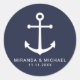 Moderne Minimalistische Nautical Navy Blue Anchor Gastgeschenk Hochzeit Sticker mit weißem Anker und personalisierten Braut und Bräutigam mit Hochzeitstermin in weißem, modernen Sans Serif Schriftart Stil auf marineblau Hintergrund. Ideal für Hochzeiten mit Wassersportaktivitäten, Hochzeiten zum Thema Strand und vieles mehr.