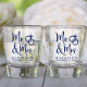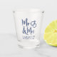 Geben Sie Ihren Hochzeitstoast und Ihren Hochzeitsgästen ein lustiges Souvenir, um Ihren besonderen Tag mit diesem maßgeschneiderten Shotglas mit "Mr & Mrs." geschrieben in einem großen marineblauen Skript und einer marineblauen Abbildung von zwei Hochzeitsringen zusammen. Fügen Sie unten Ihren Namen und Ihr Hochzeitstermin hinzu.