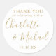 Die Gastgeschenk Hochzeit mit dem Gold und Weiß-Signatur-Script bedankt sich bei dem klassischen Rundaufkleber mit den Signaturstil-Namen. Personalisieren Sie mit Ihrer besonderen Danksagung Nachricht in schicken Gold Typografie. Entwickelt von Thisisnotme©