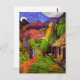 Paul Gauguin Road in Tahiti Postcard. Ölmalerei auf Leinwand aus dem Jahr 1891. Gauguin ist ein Künstler, der für seine Gemälde von Tahiti bekannt ist. Die Straße in Tahiti ist ein gutes Beispiel für die lebendige Vision des Künstlers von der tropischen Insel. Zwei Frauen gehen eine rote Schotterstraße hinunter, als ein Pferd auf grünem Gras in der Nähe eines Zaunes grasen. Eine junge Frau sitzt mit Beinen gekreuzt mit ihrem Kinn in ihrer Palme auf der Veranda einer Lehmhütte mit Palmen und lila und roten Bergen im Hintergrund. Ein großartiges Geschenk für Gauguin-Fans, Cloisonnismus, Postimpressionismus und tropische Gemälde.