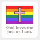 Sagen Sie allen, dass Sie schwul und Christlich sein können. Zeigt die Regenbogenflagge, überlagert mit einem rosa Kreuz, mit dem Slogan: "Gott Liebe mich so, wie ich bin."