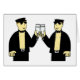 Zwei Cartoon Männer in Lederoutfits und Schattierungen, die sich gegenseitig mit Champagnergläsern toasteln. Das Bild hat einen knalligen weißen Hintergrund.