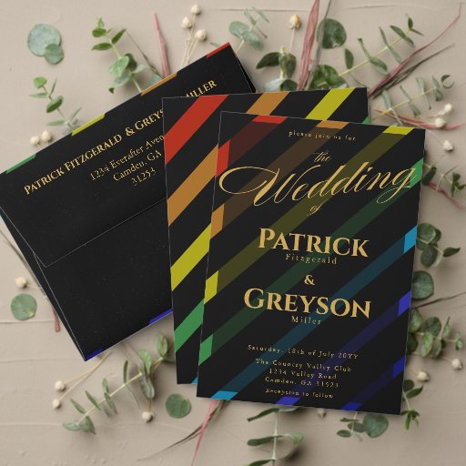 Celebrate your love with the Gay Men Wedding Elegant Rainbow collection — a complete suite of coordinating stationery designed for two grooms. Bold diagonal Progress Pride stripes on sophisticated black, with gold typography throughout. Every piece in this suite is fully customizable with your names, date, and wedding details.