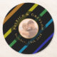 A favour guests will actually keep — this round coaster features a photo medallion of the couple at centre, the grooms' names curving elegantly around the edge, and the wedding date in gold typography, all against the signature diagonal rainbow stripes on black. Use your engagement shoot, a favourite couple photo, or any image that tells your story. A stylish bar accessory for the cocktail hour, reception, or any celebration after the wedding day.