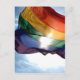 Eine flatternde Regenbogenflagge, die gegen den hellblauen Himmel flattert und Stolz und Hoffnung in der LGBT-Bewegung signalisiert.