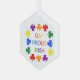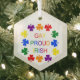 Dieses Ornament zeigt ein grafisches Bild einer Auswahl von regenbogenfarbenen Kleeblättern, die eine regenbogenfarbene Botschaft umkreisen, in der es heißt: "Gay Proud Irish". Das Design ist für alle LGBT Iren gedacht, die ihre irischen Wurzeln Liebe haben und stolz sind, schwul zu sein.