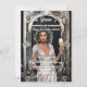 Ein verziertes Imitat silberne Vintage Kunst Deko Stil Rahmen hat eine schöne Veranschaulichung einer Melanin mit langen schulterlangen Haaren mit einem niedrig geschnittenen silbernen Figur umarmt Sequin Kleid. Sie hält ein Glas Sekt zum Toast im Neujahr auf. Gerahmt ist sie durch den verzierten und luxuriösen Vintagen Stilrahmen, der ihr formelles Kleid perfekt ergänzt. Eine Kaukasierin, die auch ein hochmodernes und schicke silberne Figur-Umarmung trägt, verleiht den Feiern eine Touch Eleganz und hat den gleichen verzierten Rahmen, der sie umgibt. Vorlagen für Ihre benutzerdefinierte Formulierung erscheinen sowohl auf der Vorder- als auch auf der Rückseite der Einladung und können zum Anzug Ihres besonderen Anlasses personalisiert sein. Diese sind ideal für Schwule, die ein Single-Party veranstalten, für ein jährliches oder silbernes Hochzeitstag, ein Festsommer oder ein fabelhaftes "New Year Party"-Fest.