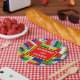 Coole Primärfarben, rot-grün-blau-weiß und grau, verknüpfte, generische Gebäude-Blockmuster aus Ziegelstein sehen aus wie lustige Spielzeuge für Kinder. Ideal für die Geburtstagsparty eines Jungen als Vorzüge und Dekorationen.