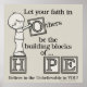Little Boy steht auf Buchstabenblöcken, die das Wort "HOPE" buchstabieren, er hält den Block mit dem Buchstaben "O", um in diesem Zitat das Wort "OTHERS" auszudrücken: "Lass dein Vertrauen in andere als Hoffnungsblöcke des Gebäude". Glauben Sie an das Unglaubliche an Sie! Zitate ©Little Boy, Big Dreams, LLC und David A. Carrizales und Kunstwerk © Christie Black von Kreationen aus dem Herzen.