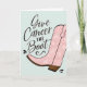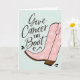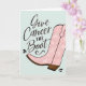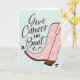Kundenspezifische Grußkarte für den Monat der Brustkrebs-Aufklärung oder zu jeder Zeit als "Get well Card", Beileid oder Gratulationskarte für Brustkrebspatientinnen und -überlebende. Das Design enthält eine feminine, pinkfarbene Cowgirl-Bootillustrierung mit modernem Typografie-Design, in dem steht: "Give Cancer the Boot".
