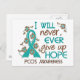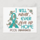 Schlagen Sie einen aquamarinen Weg der PCOS-Bewusstsein, während Sie eine inspirierende Stimmung der Hoffnung mit Ich werde niemals aufgeben Hoffnung T - Shirt, Kleidung, Knöpfe und Waren mit kontrastierenden Text-Schriftart und einem auffälligen aquamarinen PCOS-Unterband, das mit aquamarinen und schokoladenbraunen Blume verflochten ist.