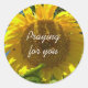 Sonnenblumen beten Aufkleber. Christliche Nachricht auf einem runden Aufkleber mit einer hellen Gartensonnenblume. Passende Karten sind verfügbar.