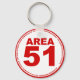 Ein Schlüsselanhänger des Bereichs 51 mit einem Warnhinweis für Personen am Rand des Feldes.