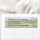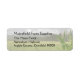 Ein Adressetikett mit einem Foto einer ländlichen Landschaft im Regen, mit einem Mais- oder Maisfeld im Hintergrund und einigen näheren Mais-Pflanze im Vordergrund, vor einem stürmischen Himmel.