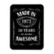 Zum 50. Geburtstag im Jahr 2023 - Made in 1973 50 Jahre phantastisch in gemischten Sans und Serifen Schriftart mit Vintagen Schriftrollen und Rahmen Verzierungen. Zum 50. Meilenstein Geburtstag.