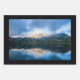 Papierblätter mit einem wunderschönen Foto. Berge im Hintergrund mit einem ruhigen See im Vordergrund. Ruhe und Entspannung.