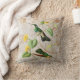 Quadratische Throwkissen-Ausrüstungsbeschreibungen eine Vintage Illustration des Weiß-throated Mountaingem Kolibris (Lampornis castaneoventris.) Zwei hellgrüne Kolibris mit Schwarzweiss-Gesichtsmasken hocken auf einer tropischen Windenrebe mit gelben Blumen, auf einem elfenbeinfarbenen Vintagen Grungehintergrund mit GoldWirbel und BlumenSilhouetten.