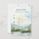 Hochzeitskarte RSVP mit landschaftlichem Aquarelldesign in staubblauen und grünen Farbtönen. Die Seeszene mit Bergen, Grünpflanzen und Kiefern, dem See und einem hellen Himmel. Der Text zum Antwortdatum ist bearbeitbar, und wenn Sie passende Produkte wünschen, schauen Sie bitte in meiner Sammlung von Mountain Lake nach.