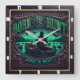 Dies ist eine stilisierte Abbildung mit einer geflochtenen lederähnlichen Textur und einem Jagdthema. Es zeigt einen Mann in einem Boot auf einem dunklen See, hält ein Gewehr und umgeben von Enten. Der Hintergrund umfasst Berge und einen leuchtenden Himmel, die alle in einer dunklen Neonfarbenpalette aus aquamarinen und orangen Farbtönen dargestellt sind. Der Begriff "GEBOREN ZU HUNT" wird sowohl oben als auch unten im Werk deutlich dargestellt.