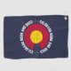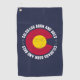 Zeigen Sie Ihren Colorado-Stolz mit diesem Golftuch, das der Colorado-Staatsflagge ähnelt. Hat die Wörter "geborenes und um die rote und gelbe Mitte gezüchtetes Colorado". Set gegen einen blauen Hintergrund. Macht ein großes Geschenk für einen Colorado-Eingeborenen! Entwurf hat ein beunruhigtes Ende.
